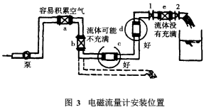 水平安裝時(shí)要使電極軸線平行于地平線,因?yàn)樘幱诘撞康碾姌O易被沉積物覆蓋,而頂部電極易被液體中偶存的氣泡擦過(guò)遮住電極表面,使輸出信號(hào)波動(dòng)。例如圖3所示管系中,c和d為適宜位置;