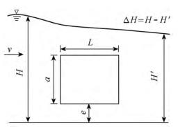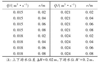 有限水域的浮體結(jié)構(gòu)在不同來(lái)流動(dòng)水中運(yùn)行時(shí),浮體結(jié)構(gòu)位置的改變會(huì)對(duì)流場(chǎng)產(chǎn)生影響,從而影響浮體結(jié)構(gòu)的泄流能力以及穩(wěn)定性。試驗(yàn)過(guò)程中固定浮體結(jié)構(gòu)的體型不變(長(zhǎng)L=0.20m,寬B=0.30m,高a=0.10m),分別選取4種不同來(lái)流流量Q及浮體結(jié)構(gòu)位置e,控制浮體結(jié)構(gòu)在上、下游水位不變的條件下進(jìn)行試驗(yàn),具體試驗(yàn)參數(shù)設(shè)計(jì)及說(shuō)明見(jiàn)表1以及圖2。