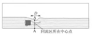 來(lái)自上游的水體經(jīng)浮體結(jié)構(gòu)的阻擋作用,水流繞流經(jīng)浮體結(jié)構(gòu)的上部和下部區(qū)域通過(guò),并在浮體結(jié)構(gòu)背水面的下游區(qū)域形成小范圍回流區(qū),此處水流紊亂,流速分布不均勻。試驗(yàn)過(guò)程中,對(duì)回流區(qū)沿水流方向的長(zhǎng)度D(水槽縱向中心斷面處,自浮體結(jié)構(gòu)背水面到沿水流方向流速為0的*遠(yuǎn)位置點(diǎn))進(jìn)行量測(cè)。選取浮體結(jié)構(gòu)下游區(qū)域回流區(qū)中心點(diǎn)所在斷面進(jìn)行流速測(cè)量對(duì)比。流速測(cè)量斷面位置A-A見(jiàn)圖3。