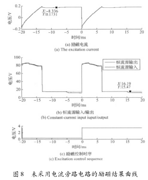 實(shí)驗(yàn)結(jié)果表明,高壓源向低壓源切換后,三端穩(wěn)壓器的工作特性致使的電流波動和低壓源供電情況下的恒流控制,會大幅延長勵磁電流的穩(wěn)態(tài)響應(yīng)時間。圖8所示勵磁電流約在17ms左右進(jìn)入穩(wěn)態(tài),圖9所示勵磁電流的穩(wěn)態(tài)響應(yīng)時間約為12ms。這表明,在采用三端穩(wěn)壓器搭建恒流控制電路的情況下,電流旁路電路能有效克服三端穩(wěn)壓器工作特性的影響,并能方便的實(shí)現(xiàn)電流超調(diào),加快勵磁電流的響應(yīng)速度。