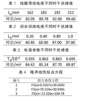 仿真試驗中,設(shè)定線圈等效電感取值范圍為 162~212mH,間隔 10mH;閉合回路等效電感范圍 0.2~1mH,間隔為 0.2mH;雙電層電容、接觸電阻隨流體電導(dǎo)率變化而變化,電導(dǎo)率增大接觸電阻和雙電層電容減小而電荷傳遞電阻增大??稍O(shè)定電極接觸電阻、雙電層電容和電荷傳遞電阻范圍分別為 5~15kΩ、10~20μF 和50~60Ω,由公式(7)知,可用 T2 表示上述三者關(guān)系。 仿真參數(shù)取值不同情況下,通過 MATLAB 工具箱對仿真測量得到的干擾峰值進(jìn)行曲線擬合畫出相應(yīng)的曲線圖。 其中仿真數(shù)據(jù)和相對應(yīng)的曲線方程如表 1~表 4 所示,曲線圖如圖 4~圖 6。