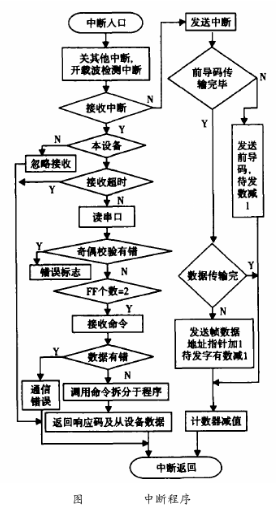 在HART通信中,地下污水流量計(jì)作為從設(shè)備進(jìn)行通訊,所以這里的軟件設(shè)計(jì)只是針對(duì)于從設(shè)備。HART通信采用水平和垂直校驗(yàn)的方法。當(dāng)檢測到接收數(shù)據(jù)有差錯(cuò)時(shí),則等到主設(shè)備命令幀發(fā)完后,通知主設(shè)備數(shù)據(jù)接收有誤。主設(shè)備則重新發(fā)命令幀,從而保證通信的準(zhǔn)確可靠。HART中斷子程序流程圖如圖6所示。由于HART通信為主從方式,HART幀中每個(gè)字節(jié)在物理層傳輸需要9ms左右,為了保證通訊的實(shí)時(shí)性,通訊程序采用串行口終端接收/發(fā)送。該中斷所要完成通信中的主要任務(wù),即接收和發(fā)送幀,幀的拆分和打包。
