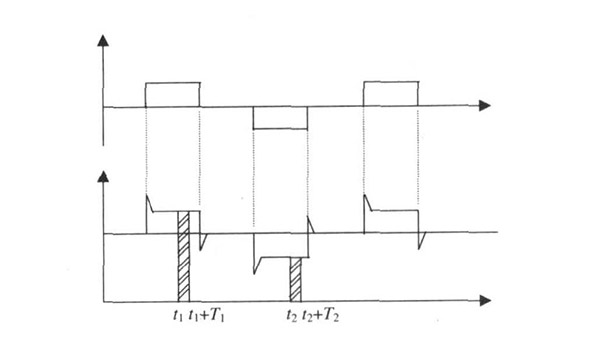 給水廠原水電磁流量計(jì)一般都采用工頻交流電源供電, 其電源電壓的幅值和頻率的變化都會給給水廠原水電磁流量計(jì)帶來電源性干擾噪聲。對電源電壓的幅值變化, 因采用多級集成穩(wěn)壓, 一般而言電源電壓的幅值變化對電磁流量的測量精度影響不大。當(dāng)電源電壓的頻率波動時(shí), 雖然其波動范圍有限, 但對給水廠原水電磁流量計(jì)測量精度影響較大。為了解決工頻干擾問題, 實(shí)現(xiàn)對流體流速感應(yīng)電勢eab信號的準(zhǔn)確測量, 需利用以下基本關(guān)系:①勵磁周期為工頻周期的整數(shù)倍, 即勵磁頻率為50/nHz(n為偶數(shù));②正負(fù)勵磁下的同相位采樣。圖2是對應(yīng)低頻矩形波勵磁形式下的典型電勢信號形式, 按上述關(guān)系在一個(gè)勵磁周期下, 若假設(shè)t1 和t2 點(diǎn)為工頻干擾的等效干擾點(diǎn), 且采樣寬度T=T1 =T2 , 則eab的基本算式為: