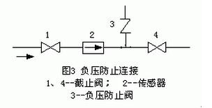 氟塑料襯里傳感器須謹(jǐn)慎地應(yīng)用于負(fù)壓管系;正壓管系應(yīng)防止產(chǎn)生負(fù)壓,例如液體溫度高于室溫的管系,關(guān)閉傳感器上下游截止閥停止運(yùn)行后,流體冷卻收縮會形成負(fù)壓,應(yīng)在傳感器附近裝負(fù)壓防止閥,如圖3所示。有制造廠規(guī)定PTFE 和PFA 塑料襯里應(yīng)用于負(fù)壓管系的壓力可在200C、1000C、1300C時使用的絕對壓力必須分別大于27、40、50KPa。