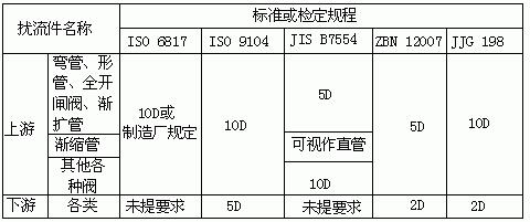 為獲得正常測量精確度,電磁流量傳感器上游也要有一定長度直管段,但其長度與大部分其它流量儀表相比要求較低。90°彎管、T形管、同心異徑管、全開閘閥后通常認(rèn)為只要離電極中心線(不是傳感器進(jìn)口端連接面)5倍直徑(5D)長度的直管段,不同開度的閥則需10D;下游直管段為(2~3)D或無要求;但要防止蝶閥閥片伸入到傳感器測量管內(nèi)。各標(biāo)準(zhǔn)或檢定規(guī)程所提出上下游直管段長度亦不一致,匯集如表1所示,要求比通常要求高,這是由于為保證達(dá)到當(dāng)前0.5級精度儀表的要求。表1