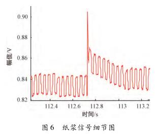 為了進(jìn)一步研究水煤漿信號(hào)的特點(diǎn),將其與紙漿信號(hào)進(jìn)行對(duì)比。通過分析課題組采集的25Hz矩形波勵(lì)磁下的紙漿信號(hào)發(fā)現(xiàn),在同樣流速下,測量介質(zhì)為紙漿時(shí),傳感器輸出信號(hào)經(jīng)調(diào)理放大后能明顯看到與流量相關(guān)的感應(yīng)電動(dòng)勢(shì)信號(hào),且其漿液干擾僅為數(shù)十毫伏,要遠(yuǎn)小于水煤漿信號(hào)中的漿液干擾,如圖5所示。對(duì)圖5所示的紙漿信號(hào)進(jìn)行局部放大,得到如圖6所示的信號(hào)??梢?,紙漿信號(hào)中的漿液干擾持續(xù)的時(shí)間也遠(yuǎn)小于水煤漿信號(hào)中的漿液干擾,且頻率較低。