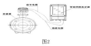 一體型管道污水流量計是由流量傳感器和轉(zhuǎn)換器(也叫顯示器)兩大部分組成。測量管上下裝有激磁線圈,通激磁電流后產(chǎn)生磁場穿過測量管,一對電極裝在測量管內(nèi)壁與液體相接觸,引出感應(yīng)電勢,送到轉(zhuǎn)換器。激磁電流則由轉(zhuǎn)換器提供。如圖2所示:
