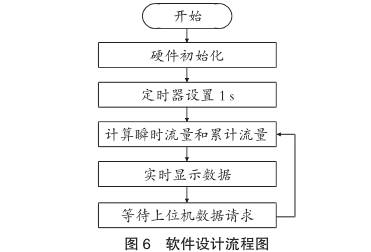 上電后程序?qū)SP的硬件資源進(jìn)行初始化,包括中斷系統(tǒng)、GPIO口、定時器/計數(shù)器、通信端口及基本的時鐘設(shè)置。程序每秒對接收到的脈沖進(jìn)行計數(shù),其除以儀表系數(shù)后的結(jié)果作為瞬時流量,同時在時間上對瞬時流量進(jìn)行累積,計算出兩種流量后,將其實時顯示在液晶顯示屏上,同時將數(shù)據(jù)保存,**等待上位機電腦對數(shù)據(jù)的讀取。通信采用MODBUS協(xié)議,波特率為9600b/s,無校驗,8位數(shù)據(jù)位,1位停止位。圖6為微處理器功能設(shè)計流程圖。