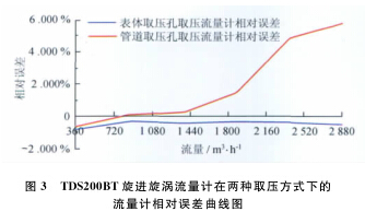 從以上數(shù)據(jù)表和曲線圖中可以看出:天燃?xì)饬髁坑?jì)型號(hào)一定的情況下,用表體取壓孔取壓方式檢定流量計(jì)時(shí)流量計(jì)的線性度較好,用管道取壓孔取壓方式檢定流量計(jì)時(shí)流量計(jì)的線性度較差;流量測(cè)點(diǎn)相同的情況下,表體取壓孔取壓檢定方式的流量計(jì)誤差較小,管道取壓孔取壓檢定方式的流量計(jì)誤差較大;兩種取壓方式引起的誤差隨著流量的增大而逐漸增大,在流量為2 900m3/h時(shí)兩者相差近6.2%,遠(yuǎn)遠(yuǎn)超出了流量計(jì)的準(zhǔn)確度等級(jí)。所以,在天燃?xì)饬髁坑?jì)的檢定過(guò)程中,應(yīng)避免在流量計(jì)表體取壓孔以外的地方取壓進(jìn)行檢定。