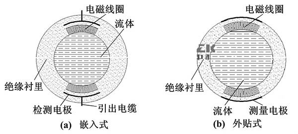 電容式管道式電磁流量計(jì)從根本上解決了電極表面附著、腐蝕、摩擦等問題,其電極與被測流體間有絕緣襯里隔離,或者直接采用絕緣測量管。電極置于測量管外面或鑲嵌于測量管內(nèi)部。嵌人式管道式電磁流量計(jì)和外貼式管道式電磁流量計(jì)的結(jié)構(gòu)如圖2所示。