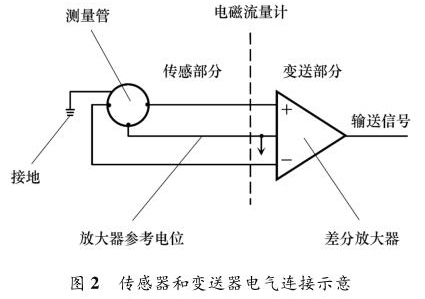 智能型防腐電磁流量計(jì)主要由兩部分組成:流量傳感器和信號(hào)變送器,如圖 2 所示。傳感器上的勵(lì)磁線圈接受變送器傳輸來(lái)的勵(lì)磁電流產(chǎn)生磁場(chǎng),輸出感應(yīng)電動(dòng)勢(shì)信號(hào);信號(hào)變送器則將感應(yīng)電動(dòng)勢(shì)信號(hào)轉(zhuǎn)換為流量信號(hào)或模擬量信號(hào)送至控制系統(tǒng)。智能型防腐電磁流量計(jì)按組成方式分為一體式和分體式。智能型防腐電磁流量計(jì)穩(wěn)定工作另外一個(gè)重要條件是接地。當(dāng)流體流動(dòng)穿過(guò)磁場(chǎng)時(shí),以導(dǎo)電流體本身作為參考電位,在測(cè)量管一側(cè)電極產(chǎn)生正電勢(shì),另一側(cè)產(chǎn)生負(fù)電勢(shì),形成電勢(shì)差。但此電動(dòng)勢(shì)信號(hào)一般只有幾毫伏,易受外界干擾。為防止干擾,將參考電位接入大地作為零電位,保證傳感器輸出精確穩(wěn)定的信號(hào)。傳感器和轉(zhuǎn)換器的接地端必須與被測(cè)介質(zhì)同電位,才能構(gòu)成對(duì)稱的輸入輸出回路。