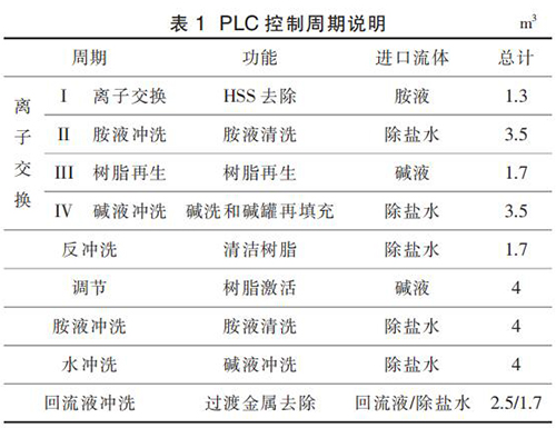 APU 的運(yùn)行按照事先設(shè)定的程序運(yùn)行,即嚴(yán)格遵循設(shè)定的步驟順序。 APU 的正確運(yùn)行依賴于每個(gè)步驟的順利完成。 按照預(yù)先設(shè)定好的步驟完成 1 個(gè)任務(wù)即視為完成 1 個(gè) APU 運(yùn)行的“周期”。 離子交換的主周期被稱為“離子交換周期”。除此之外,整個(gè)控制程序還包含另外 5 個(gè)輔助周期, 分別為反沖洗周期、調(diào)節(jié)周期、胺液沖洗周期、水沖洗周期、回流液沖洗周期。 這 5 個(gè)周期在維護(hù)和非計(jì)劃停車后重新啟動(dòng)時(shí)使用。 PLC 控制各個(gè)周期的說(shuō)明見(jiàn)表 1。