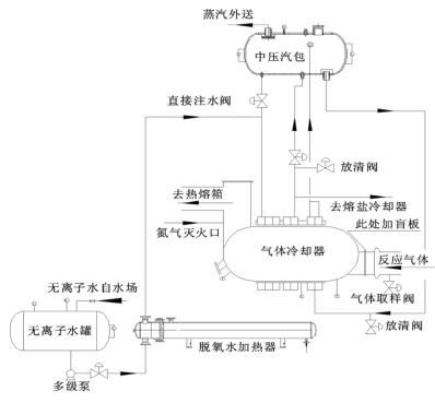 來自無離子水罐的脫氧水經(jīng)多經(jīng)泵加壓、經(jīng)脫氧水加熱器加熱后進入到煤氣流量計的水段,脫氧水與反應氣體換熱后分兩路:一路進入中壓汽包,保證汽包有穩(wěn)定的液位;一路進入熔鹽冷卻器帶出熔鹽攜帶的反應熱。來自中壓汽包的高溫水經(jīng)管路接至煤氣流量計汽段底部,高溫水與反應氣體換熱后產(chǎn)生高壓蒸汽,高壓蒸汽又返回中壓汽包。汽包還有一路直接注水管路,此路水不經(jīng)過煤氣流量計水段,而是直接進入汽包。在煤氣流量計出口溫度偏低而汽包液位也比較低時,可開此直接注水管路來穩(wěn)定汽包液位。其詳細流程圖如圖 2。