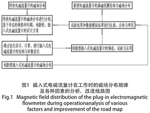 電磁流量計因其特殊的結(jié)構(gòu)形式,致使其抗干擾能力較弱、準(zhǔn)確度偏低以及瞬時流量波動過大等不良現(xiàn)象,但便于安裝、造價低廉、普遍應(yīng)用于大管道等特點而存在。為了發(fā)揮其優(yōu)勢,消除其不利因素,對其內(nèi)部結(jié)構(gòu)及其相關(guān)技術(shù)參數(shù)進(jìn)行優(yōu)化設(shè)計,從而使其準(zhǔn)確度能夠達(dá)到 ±1% FS,使抗干擾能力得到極大地增強。本文主要通過優(yōu)化設(shè)計、選擇材料和試驗,使電磁流量計的穩(wěn)定性和準(zhǔn)確度大幅度提高,并提出解決措施,對實際應(yīng)用具有參考價值。分析與研究程序圖如圖 1 所示。