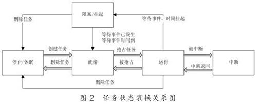 μC/OS-III 中的每一個任務都是無限循環(huán)的 。 每個任務會有五種狀態(tài),并且處于五種狀態(tài)之一。 這五種狀態(tài)分別是:睡眠態(tài)、就緒態(tài)、運行態(tài)、等待態(tài)以及中斷服務態(tài)。 睡眠態(tài)是指任務只是以代碼的形式存在于程序空間, 并未交給操作系統(tǒng)進行管理; 就緒態(tài)是指系統(tǒng)為任務配備了任務控制塊且在任務就緒表中進行了就緒登記,使任務具備了運行的充分條件;運行態(tài)是指處于就緒態(tài)的任務如果經(jīng)調度器判斷獲得了 CPU 的使用權時的狀態(tài);等待態(tài)則是正在運行的任務,需要等待一段時間或需要等待一個事件發(fā)生再運行; 中斷服務狀態(tài)是指一個正在運行的任務一旦響應中斷申請就會中止運行而去執(zhí)行中斷服務程序。這五種狀態(tài)在系統(tǒng)管理下的轉換關系由圖 2 所示。