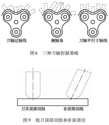 四軸加工中采用球頭銑刀,刀軸控制策略是提高加工效率和轉(zhuǎn)子曲面表面粗糙度的關(guān)鍵。如圖 8所示,刀軸控制策略有常見的刀軸過軸線、側(cè)傾角、刀軸平行于軸線。筆者采用平行軸線銑削加工方式對這 3 種刀軸控制策略進(jìn)行實際加工對比,得出采用側(cè)傾角刀軸控制策略加工出的轉(zhuǎn)子曲面表面粗糙度*好。其原因主要由于刀軸平行于軸線這種刀軸控制策略采用球頭銑刀加工時,其刀具切削轉(zhuǎn)子曲面時的接觸點(diǎn)為刀具的頂部,球頭銑刀的頂部直徑為零,線速度也為零。此時刀具是在擠壓工件,刀具頂部也容易磨損。刀軸過軸線策略雖然刀具與轉(zhuǎn)子曲面的接觸點(diǎn)一直在變換,但是也有刀位點(diǎn)是采用刀具頂部去切削。側(cè)前傾角刀軸控制策略: 控制刀具與轉(zhuǎn)子曲面接觸點(diǎn)的位置,避免球頭銑刀頂部銑削轉(zhuǎn)子曲面,實現(xiàn)刀尖的點(diǎn)的偏離,提高刀具切削點(diǎn)的線速度。球頭銑刀頂部切削和非頂部切削如圖 9 所示。