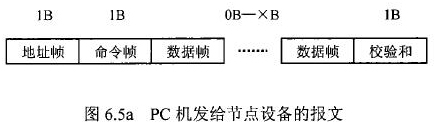 在測(cè)水流量計(jì)等節(jié)點(diǎn)設(shè)備和C機(jī)通信的過程中,由地址幀、命令幀、數(shù)據(jù)幀、校驗(yàn)和可組成各種功能不同的報(bào)文。由于采用主從工作方式來實(shí)現(xiàn)通信,測(cè)水流量計(jì)等節(jié)點(diǎn)設(shè)備僅能接收并執(zhí)行PC機(jī)發(fā)送來的控制命令,而不能發(fā)送命令給PC機(jī)。因此,由PC機(jī)發(fā)往流量計(jì)等節(jié)點(diǎn)設(shè)備的報(bào)文一般包括一個(gè)地址幀,一個(gè)命令幀,若干個(gè)數(shù)據(jù)幀和一個(gè)校驗(yàn)和,其報(bào)文格式圖.6a5所示;而由流量計(jì)等節(jié)點(diǎn)設(shè)備發(fā)往PC機(jī)的報(bào)文一般包括一個(gè)地址幀,若干個(gè)數(shù)據(jù)幀和一個(gè)校驗(yàn)和,其報(bào)文格式如圖6.5b所示。