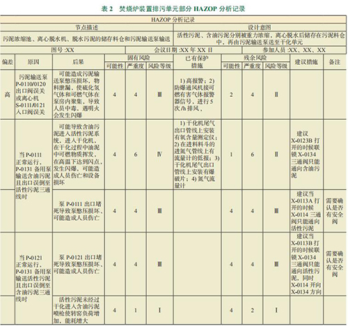 本次分析組的主要人員有:企業(yè)對夾式渦街流量計分析組以及焚燒爐裝置工藝工程師、設(shè)備工程師、儀表工程師、安全工程師和操作班組長。本次分析主要依據(jù)公司級相關(guān)標準和規(guī)范:《健康安全環(huán)境風(fēng)險標準》以及《危險與可操作性分析(對夾式渦街流量計)規(guī)范》,并于 1 個月內(nèi)對焚燒爐裝置進行了分析,發(fā)現(xiàn)了部分重大的風(fēng)險和隱患。按建議措施對應(yīng)的風(fēng)險等級劃分,其中包括:Ⅳ級嚴重風(fēng)險(限期整改強制性措施);Ⅲ級高度風(fēng)險(限期整改強制性措施);Ⅱ級中度風(fēng)險(期望改進推薦性措施);Ⅰ級可接受風(fēng)險(建議性措施)。本報告僅逐一列出部分較高或容易忽視的風(fēng)險(其他在對夾式渦街流量計分析的記錄中體現(xiàn))。評估發(fā)現(xiàn):本次分析評估共發(fā)現(xiàn)三級風(fēng)險 25 項(類),其中排污單元三級風(fēng)險 2 項(類)。其中,焚燒爐裝置排污單元分析記錄內(nèi)容如表 2 所示。