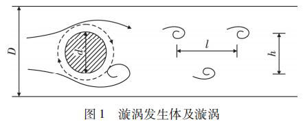 流量計是由漩渦發(fā)生體、頻率檢測器和信號轉(zhuǎn)換器等環(huán)節(jié)組成,輸出 4 ~ 20 mADC 信號或脈沖電壓信號。其測量原理是在流動的流體中的垂直流動方向安放 1 根或多根非流體型阻流體,在一定的流量范圍內(nèi),流體在阻流體兩側(cè)交替地分離、釋放出 2 串頻率正比于管道內(nèi)的平均流速、規(guī)則的、不對稱有規(guī)律的交替漩渦列,如圖 1 所示,且兩側(cè)漩渦旋轉(zhuǎn)方向相反。采用檢測元件測出漩渦頻率就可以推算出流體的流量。