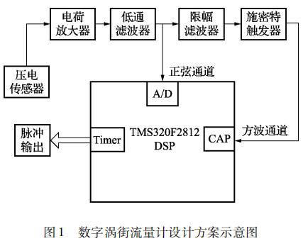 本文設計的基于 TMS320F2812 DSP 的數字鍋爐煙氣流量計的信號處理系統由前置放大電路和數字信號處理電路兩部分組成。本文選用的前置放大電路即為目前被廣泛應用的普通流量計的前置放大電路,主要由電荷放大電路、低通濾波電路、限幅濾波電路和施密特觸發(fā)電路組成; 對于經壓電傳感器測得的渦街信號采用了頻域分析和時域分析相結合的方式,即由前置放大電路和數字信號處理電路相配合。時域分析通道利用 DSP 事件管理器的捕獲模塊,對前置放大電路輸出的方波進行頻率計算,然后再由 DSP 事件管理器通用定時器的比較輸出模塊進行脈沖輸出。頻域分析通道即 DSP對低通濾波電路輸出的疊加了許多噪聲的正弦信號進行 A/D 采樣,再利用 DSP 對 A/D 采樣的結果進行頻譜分析,從而得出此時渦街信號的頻率,*后由 DSP 通用定時器的比較輸出模塊進行脈沖輸出。系統設計方案示意圖如圖 1 所示。