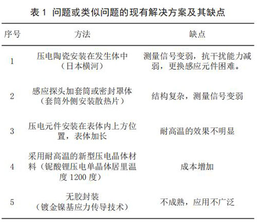 3) 當(dāng)前技術(shù)系統(tǒng)存在的問(wèn)題。 由于目前使用的傳感器檢測(cè)感應(yīng)元件為壓電陶瓷,其極化時(shí)居里溫度大約420 ~ 460℃,因此只能在低于 240℃介質(zhì)中使用,一旦被測(cè)量介質(zhì)的溫度高于 240℃,液態(tài)液化氣流量計(jì)傳感器便會(huì)因壓電陶瓷達(dá)到居里點(diǎn),絕緣電阻降低,壓電信號(hào)變?nèi)醵А?br /> 4)問(wèn)題或類(lèi)似問(wèn)題的現(xiàn)有解決方案及其缺點(diǎn)(見(jiàn)表 1)。
