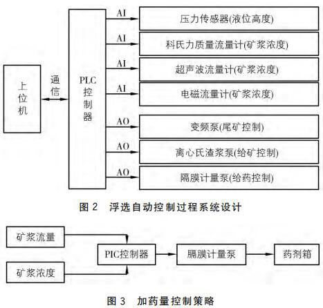 圖3中的礦漿流量與礦漿濃度分別由科氏質(zhì)量流量計(jì)和超聲波流量計(jì)測(cè)得,并 以4~20mA 電流信號(hào)傳送給 PLC控制器。由 PLC控制器根據(jù)電流信號(hào)值計(jì)算出實(shí)際的礦漿濃度和礦漿流量值,對(duì)上述兩個(gè)值進(jìn)行邏輯處理以及運(yùn)算,得出實(shí)時(shí)加藥量。PLC 控制器將計(jì)算出的實(shí)時(shí)加藥量數(shù)據(jù)以4~20mA 的電流信號(hào)發(fā)送給隔膜計(jì)量泵,由其控制并實(shí)現(xiàn)加藥量過程的自動(dòng)控制。