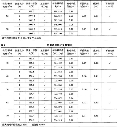 表1是用容積法現(xiàn)場(chǎng)檢測(cè)流量計(jì)后,電腦自動(dòng)生成的原始記錄數(shù)據(jù)頁(yè)部分,表2是用質(zhì)量法現(xiàn)場(chǎng)檢測(cè)流量計(jì)后,電腦自動(dòng)生成的原始記錄數(shù)據(jù)頁(yè)部分。