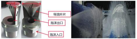 圖 1 為電弧風(fēng)扇噴嘴的結(jié)構(gòu)和噴霧,一種新型的噴嘴主要由一個智能渦街流量計入口、出口和導(dǎo)流葉片組成。出流口的圓柱形設(shè)計降低了湍流強度。導(dǎo)流葉片類似于流線型尾部,產(chǎn)生類似于弧形風(fēng)扇形狀的智能渦街流量計噴霧,其形狀類似于掘進(jìn)機的粉塵源。