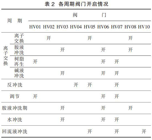 5)回流沖洗周期。 胺液每天都需取樣化驗,如果發(fā)現(xiàn)胺液中有不溶或懸浮的過渡金屬聚集,則每天運行周期結(jié)束后需利用回流液對樹脂進(jìn)行清洗,以防止腐蝕和樹脂損壞。 如果選擇了此選項,PLC程序會在每天完成目標(biāo)數(shù)量的離子交換周期后,自動執(zhí)行回流液清洗周期。 各周期閥門對應(yīng)開關(guān)情況,如表 2 所示。