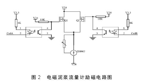 圖中的勵磁電路工作內(nèi)容是控制儀表的工作磁場。其作用原理為 :單片機(jī) MSP430F2418 定時(shí)器產(chǎn)生了雙頻矩形波,并經(jīng)光耦隔離后與兩片場效應(yīng)管組成了開關(guān)電路,從而實(shí)現(xiàn)了泥漿流量計(jì)使用的通斷功能。另一個(gè)電路 DH902 是恒流管,其為設(shè)備使用提供恒定的勵磁電流。具體來說,當(dāng) MCU 定時(shí)器的脈沖寬度調(diào)制(PWM)輸出后,經(jīng)過濾波就能有效控制勵磁電流的幅值,進(jìn)而產(chǎn)出雙頻矩形波。如圖 2 所示,為電磁泥漿流量計(jì)勵磁電路圖。