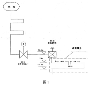 異形孔板安裝在鍋爐30米處連排管段,截去一段加裝U形管段的來(lái)流直管段上,根據(jù)安裝要求,測(cè)點(diǎn)位置選在距離上游直管段1810mm,距離下游直管段1085mm處。符合“距離上游直管段>10D(D=56mm,管道內(nèi)徑),距離下游直管段>5D”的要求??装宓娜汗転榇怪毕蛳?,圓缺孔板的弦與管道橫截面水平中心線(xiàn)平行安裝。其改造安裝圖如圖1所示。